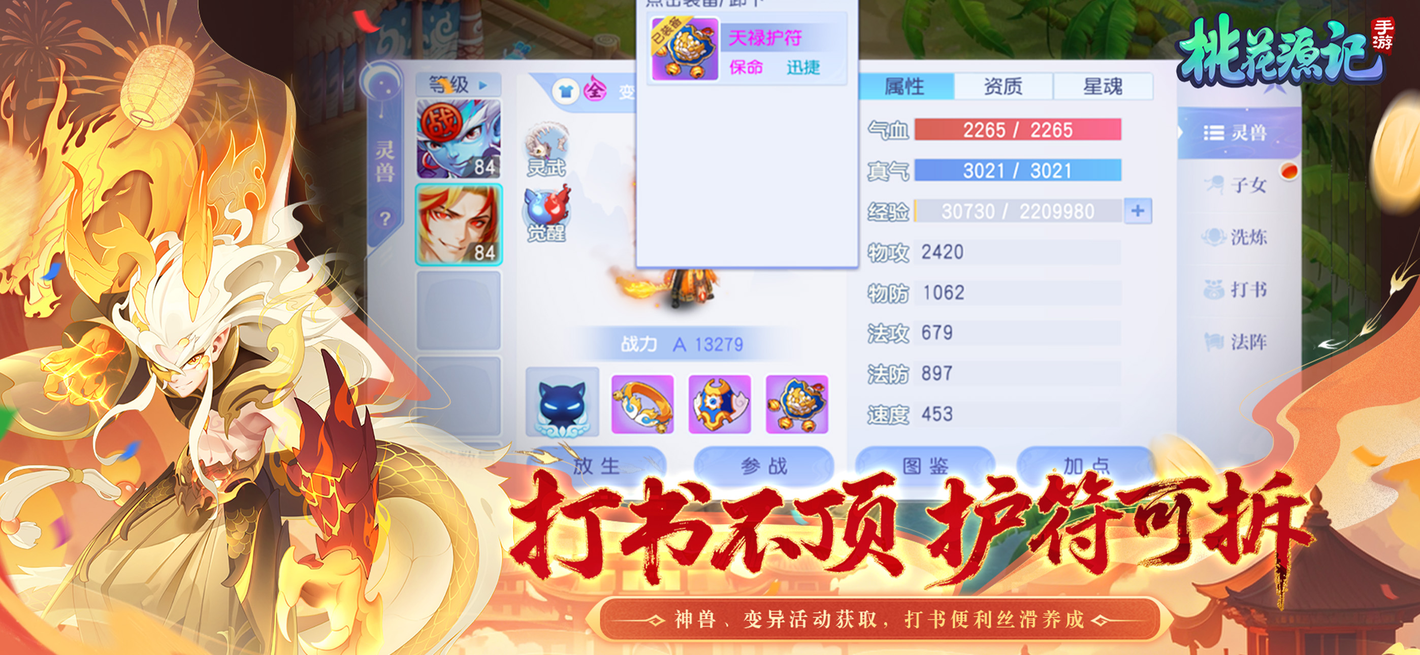 风之兽血-行动时概率自己获得乘风状态,达到5层后主人将提升等级*2.5速度的状态。转换后的状态持续3回合。(单个灵兽每回合最多为自己增加一层状态,使用道具不增加)