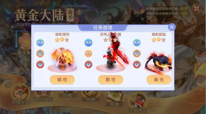 1、任务首领解锁后,黄金大陆主题界面中出现任务首领图标。